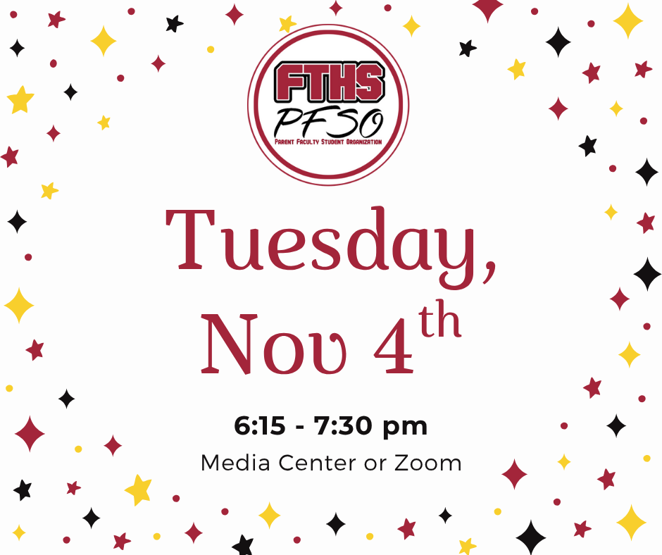 We’re excited to invite you to our next PFSO meeting on Tuesday, November 4th at 6:15 PM. Come join us in the Media Center — or cozy up at home and join us on Zoom.