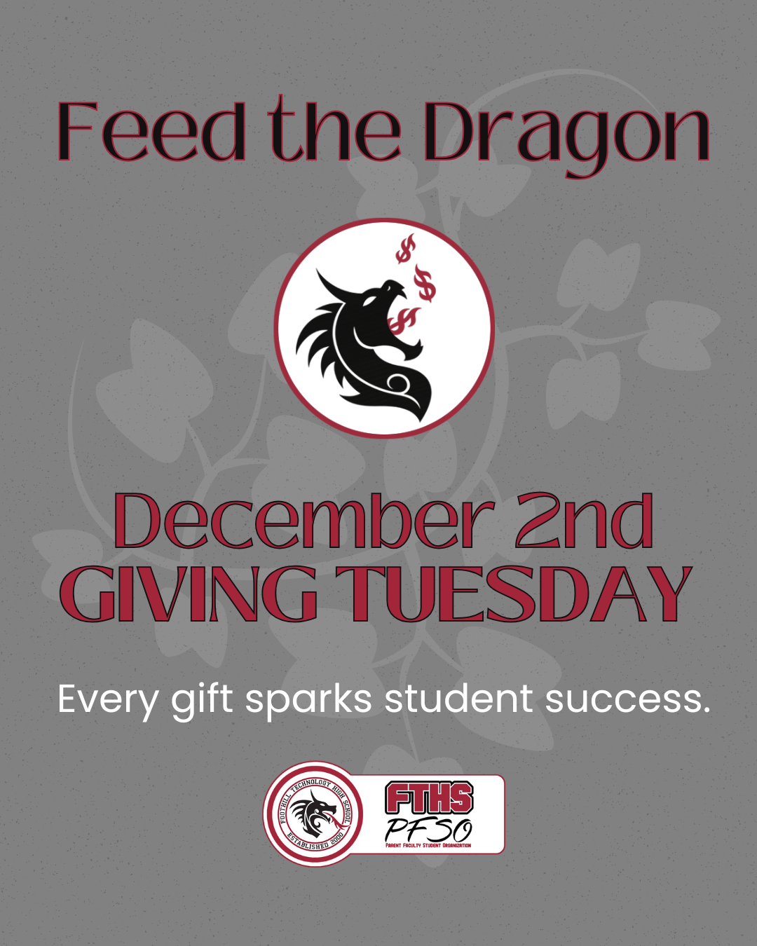 This Giving Tuesday, December 2nd, PFSO invites you to participate in “Feed the Dragon”, our annual direct donation campaign supporting every student at our school. Your contributions go directly toward programs, classroom resources, enrichment activities, and initiatives that make a meaningful difference in student learning and school life.