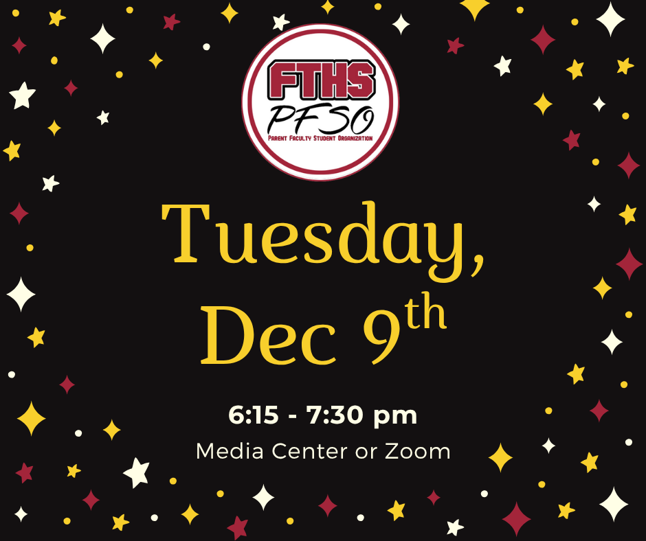 We’re excited to invite you to our next PFSO meeting on Tuesday, December 9th at 6:15 PM. Come join us in the Media Center — or cozy up at home and join us on Zoom.