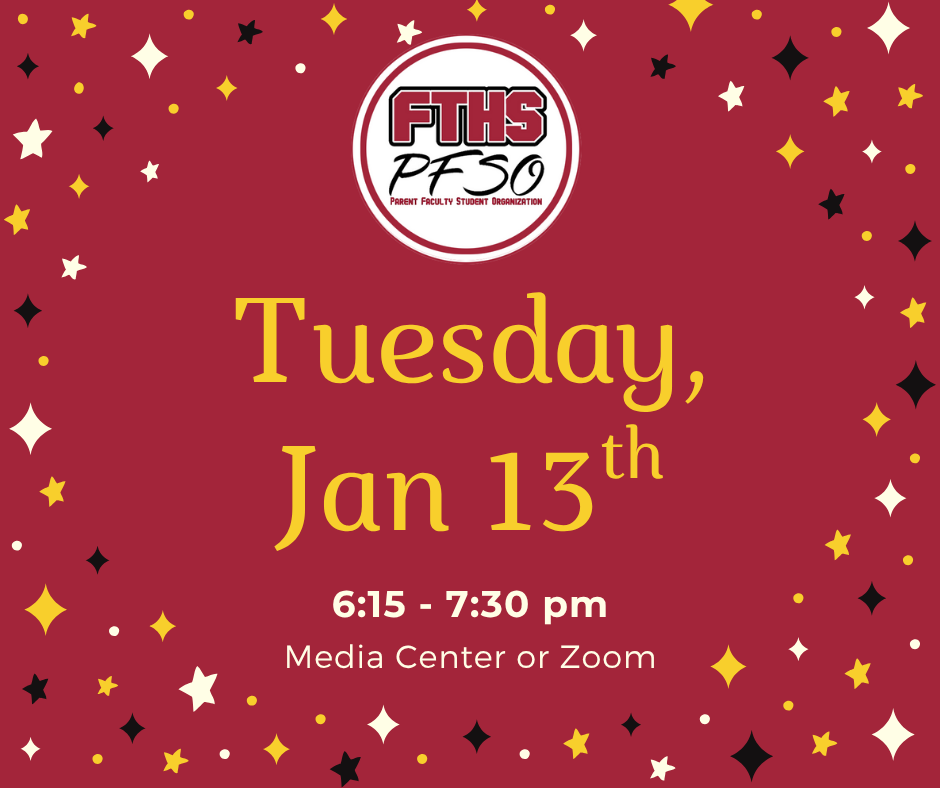 We’re excited to invite you to our next PFSO meeting on Tuesday, Januar 13th at 6:15 PM. Come join us in the Media Center — or cozy up at home and join us on Zoom.