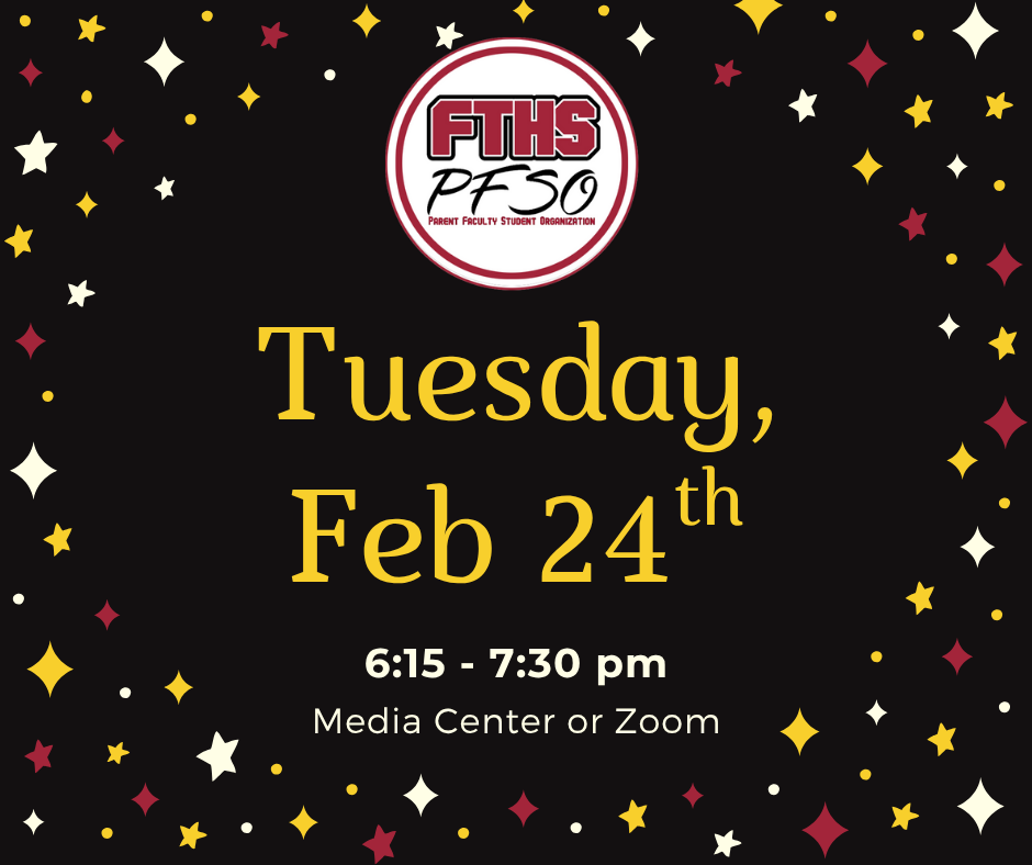 We’re excited to invite you to our next PFSO meeting on Tuesday, February 24th at 6:15 PM. Come join us in the Media Center — or cozy up at home and join us on Zoom.